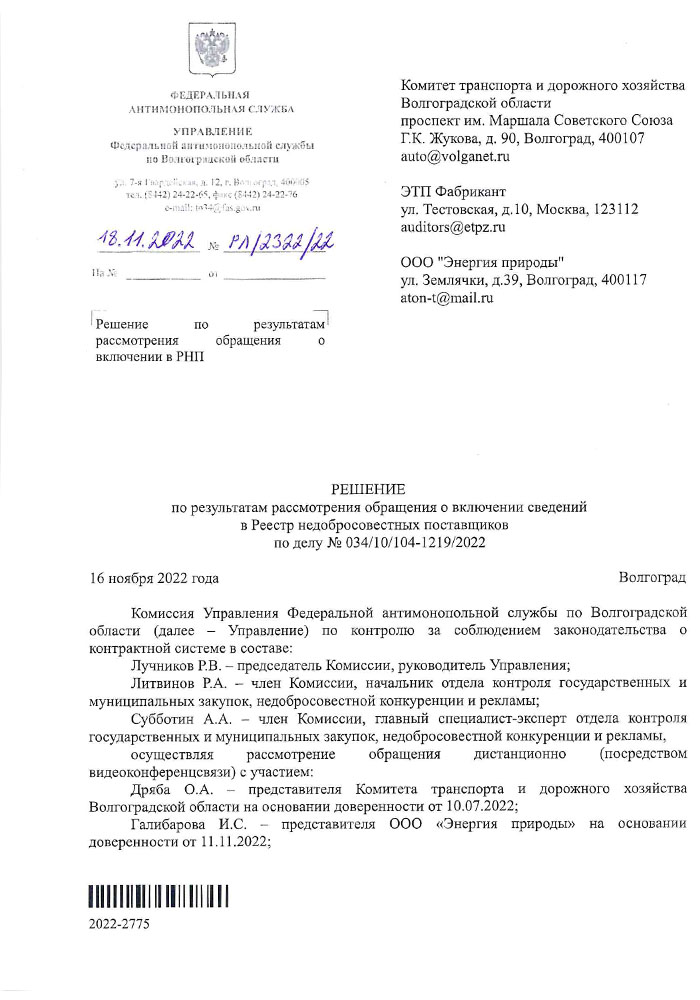 Решение УФАС Волгоградской области по ООО Энергия природы
